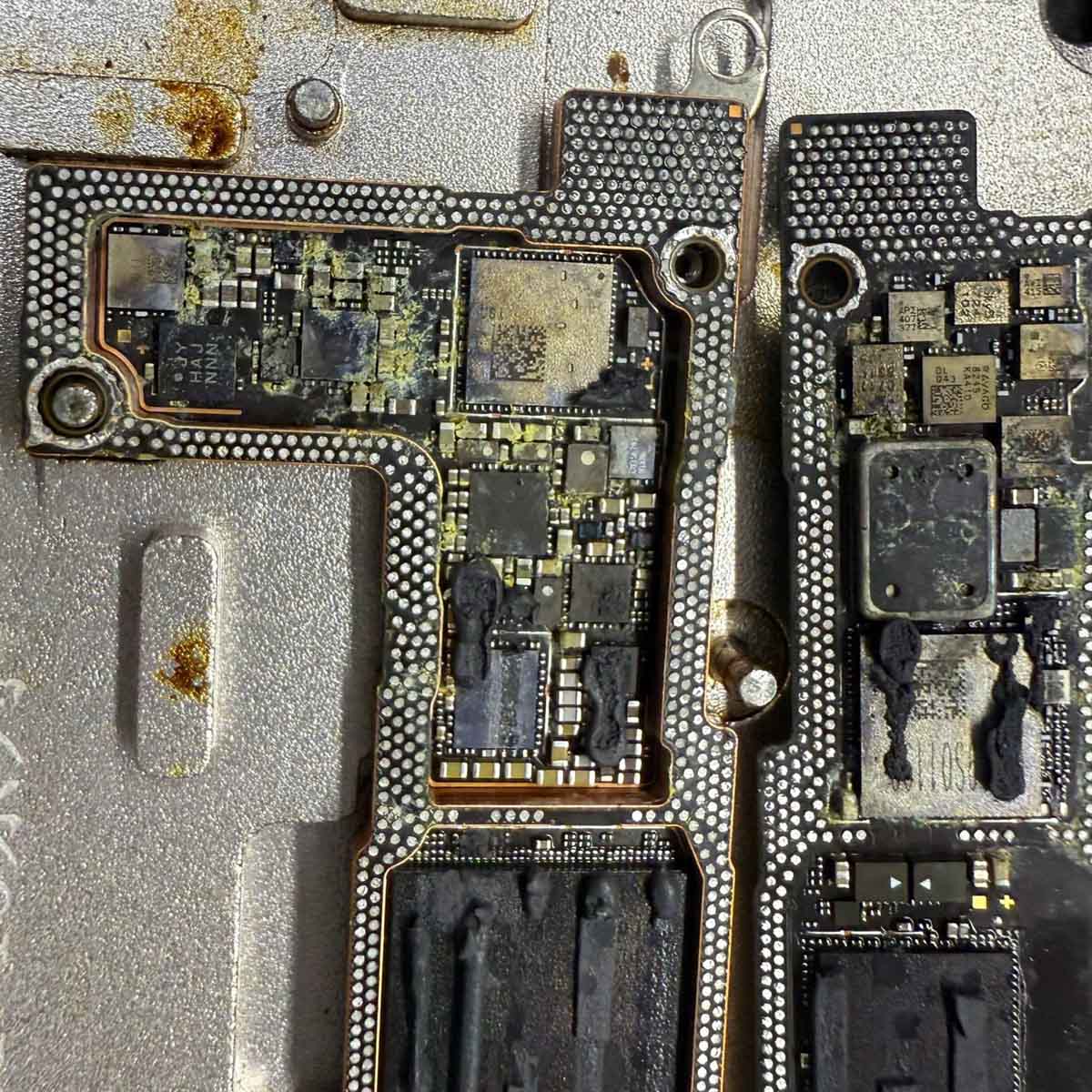 - Liquid-damaged motherboard components